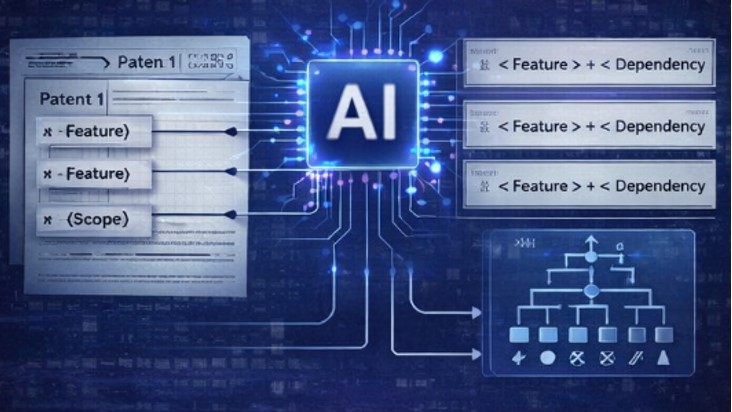 Patent claims are processed and decomposed into structured, machine-readable elements such as individual limitations, dependencies, and scope qualifiers. By breaking down complex legal language into organized components, AI enables precise comparison and downstream analysis, making it easier to understand how each part of a claim contributes to the overall protection.