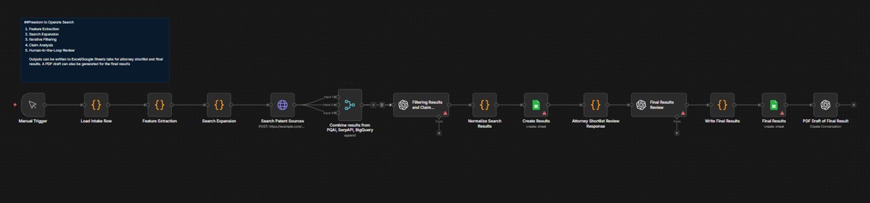 After the patents have been analyzed for features, they can be pipelined for FTO search. Additionally, new other patents can be found by using the AI n8n workflow, then the following can be done: