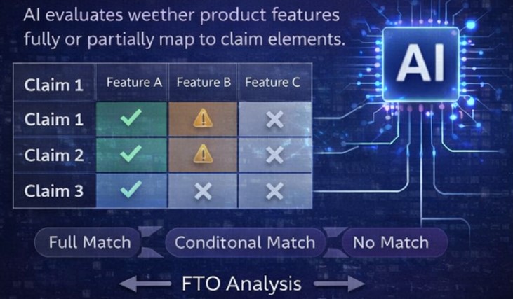 AI evaluates the degree to which product features map to the structured claim elements, determining whether there is a full match, partial overlap, or no correspondence. This analysis helps quantify potential infringement risk by assessing how comprehensively the product falls within the scope of one or more claims, while also highlighting gaps or distinctions that may reduce exposure.