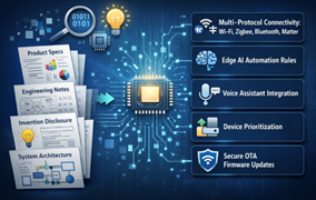 Consider a smart home technology company developing a next‑generation IoT hub designed to orchestrate multiple connected devices. The hub includes features such as multi‑protocol wireless connectivity (Wi‑Fi, Zigbee, Bluetooth), edge‑AI automation rules, voice assistant integration, device prioritization, and secure Over‑the‑Air firmware updates.