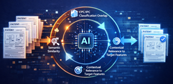 AI progressively filters results by analyzing semantic similarity, CPC/IPC classification overlap, and contextual relevance to target features. This iterative loop reduces noise while maintaining discovery breadth.