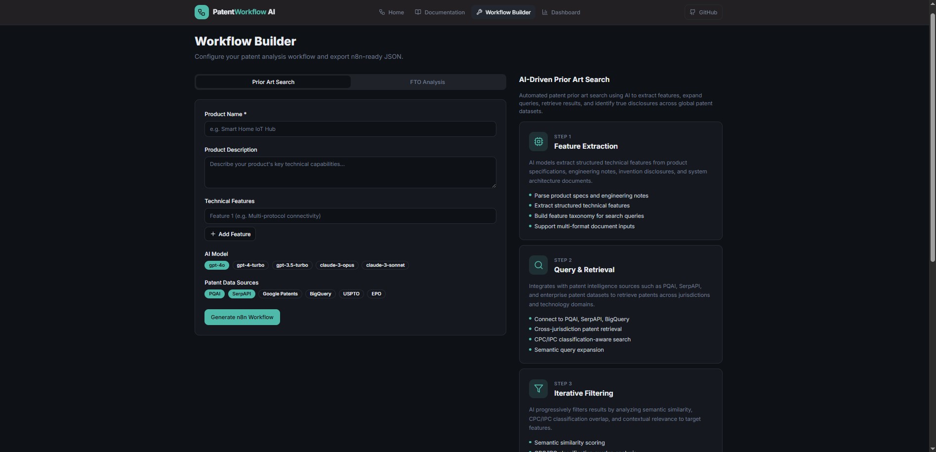 The visual Workflow Builder provides an intuitive interface for configuring patent analysis parameters. Users select the workflow type, enter product details, choose an AI model (GPT-5/GPT-5.2, Claude 4.6, etc.), pick patent data sources, and generate production-ready n8n JSON - downloadable with a single click.